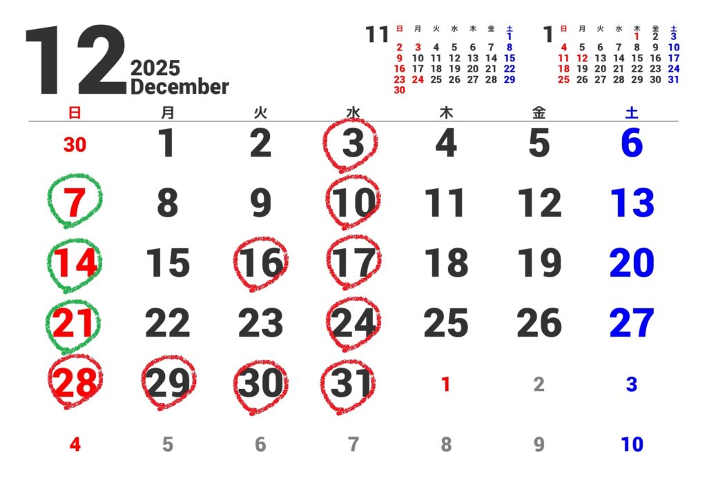 2025年12月の休診日 2025年10月31日 スタッフブログ 最新情報 皆さん、こんにちは。院長の内山です。 12月の休診日についてです。 休診日は毎週水曜日と16日(臨時休診) 午前中のみの診察は毎週日曜日(28日を除く) 年末年始の休みは28日からとなります。 よろしくお願いいたします。 「2025年11月の休診日」