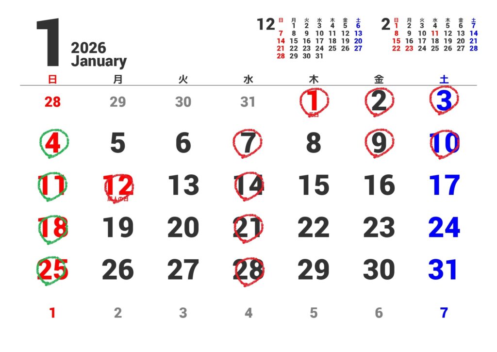 2026年1月の休診日 2025年12月14日 スタッフブログ 最新情報 皆さん、こんにちは。院長の内山です。 1月の休診日についてです。 休診日は毎週水曜日と1日2日3日(年始休み)9日10日(臨時休診)12日(成人の日)になります。 午前中のみの診察は毎週日曜日になります。 よろしくお願いします。 「2025年12月の休診日」